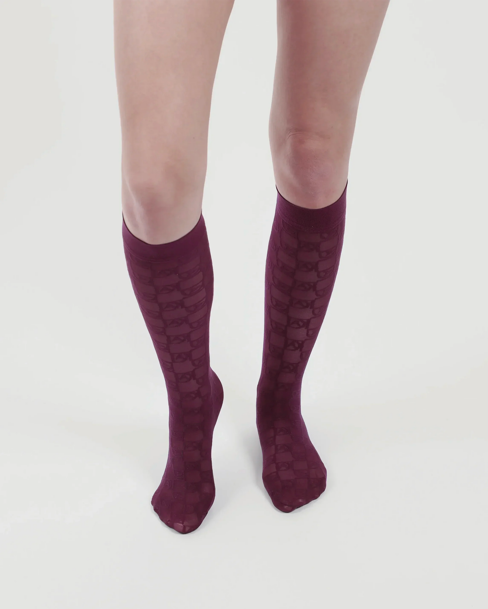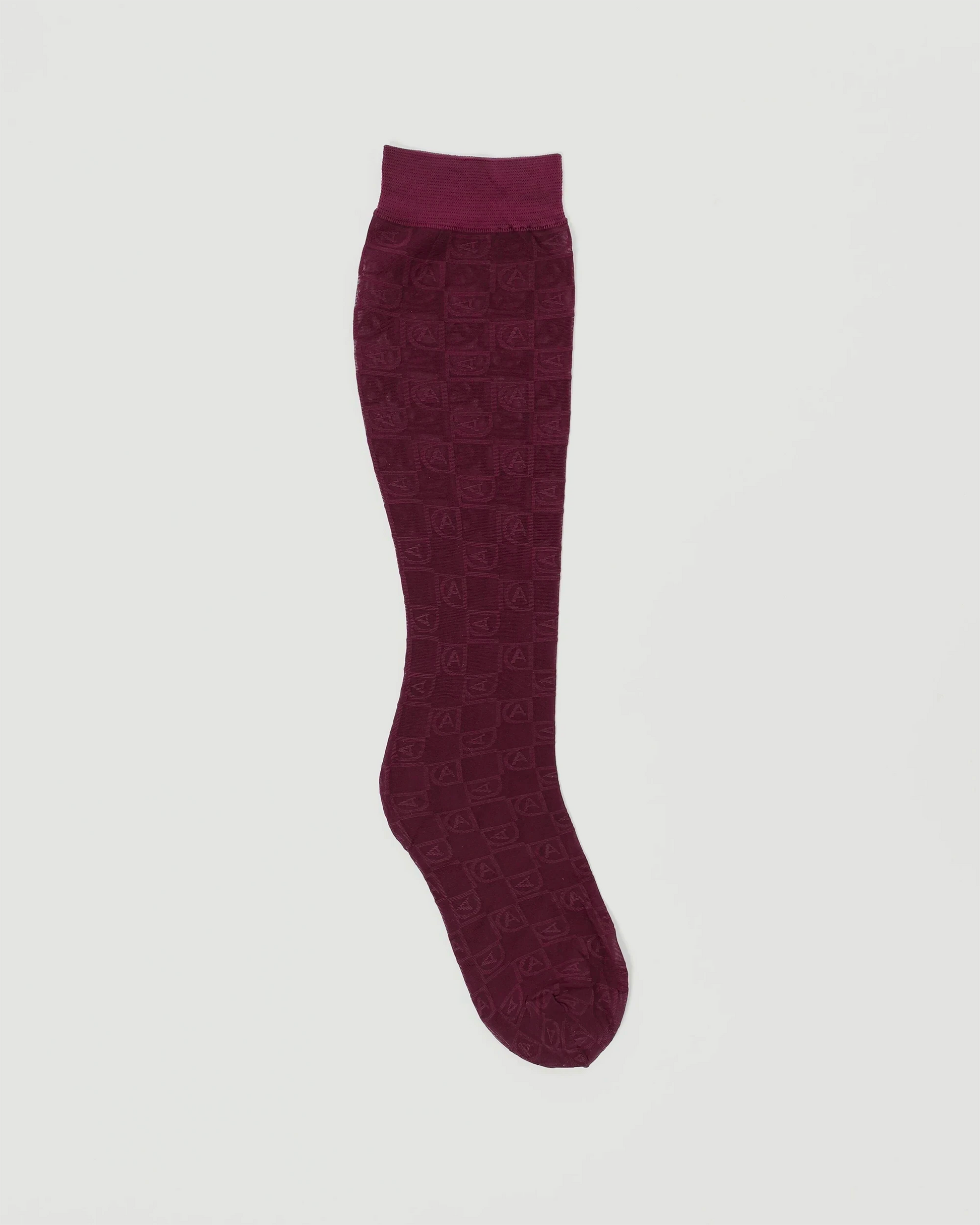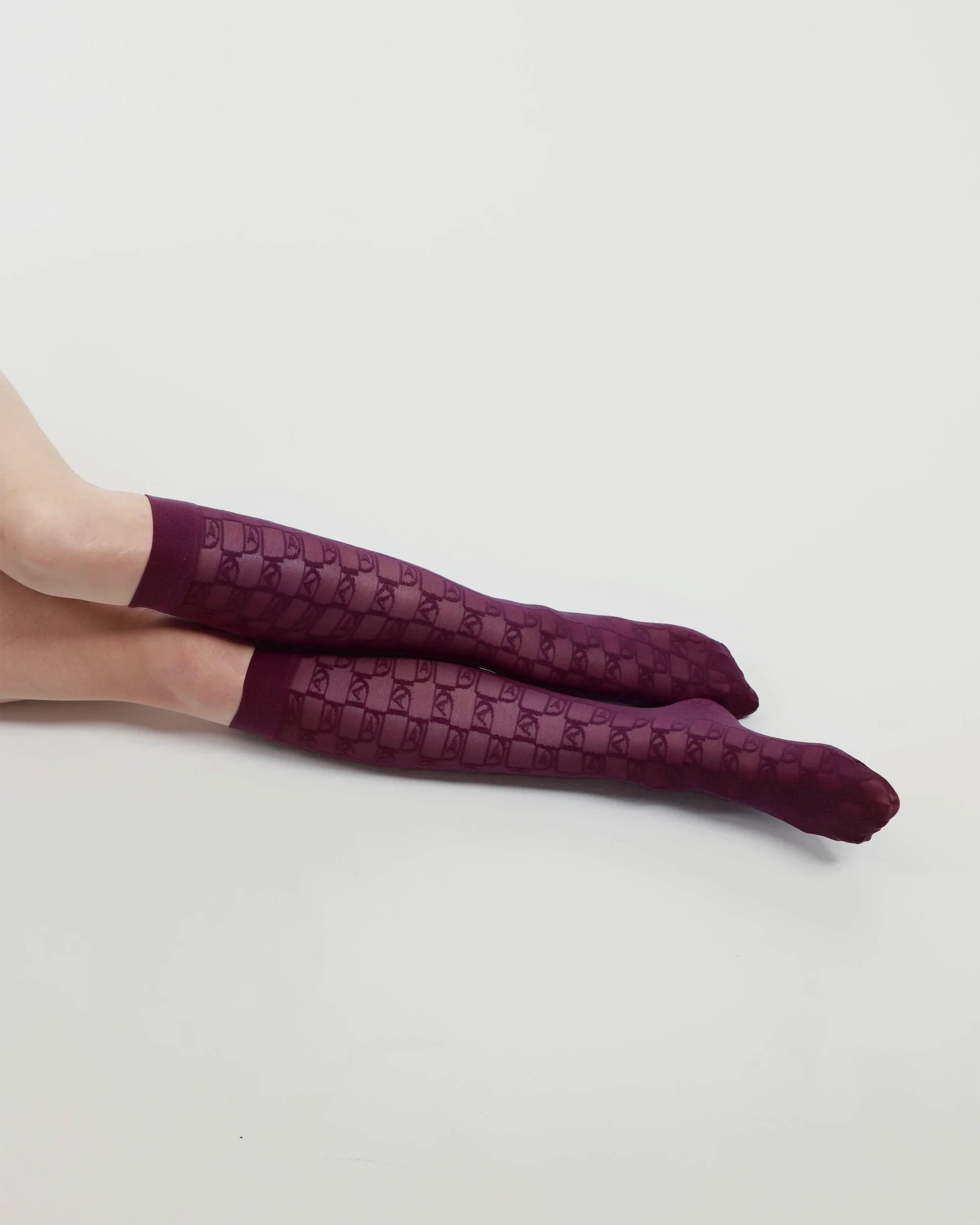 Una ripetizione del monogramma introduce la calzetteria DAL 1992. Calzini velati al ginocchio con fascia rinforzata. Lavorato a maglia in Italia, tinto a mano in Australia per l'intima arte del vestirsi.