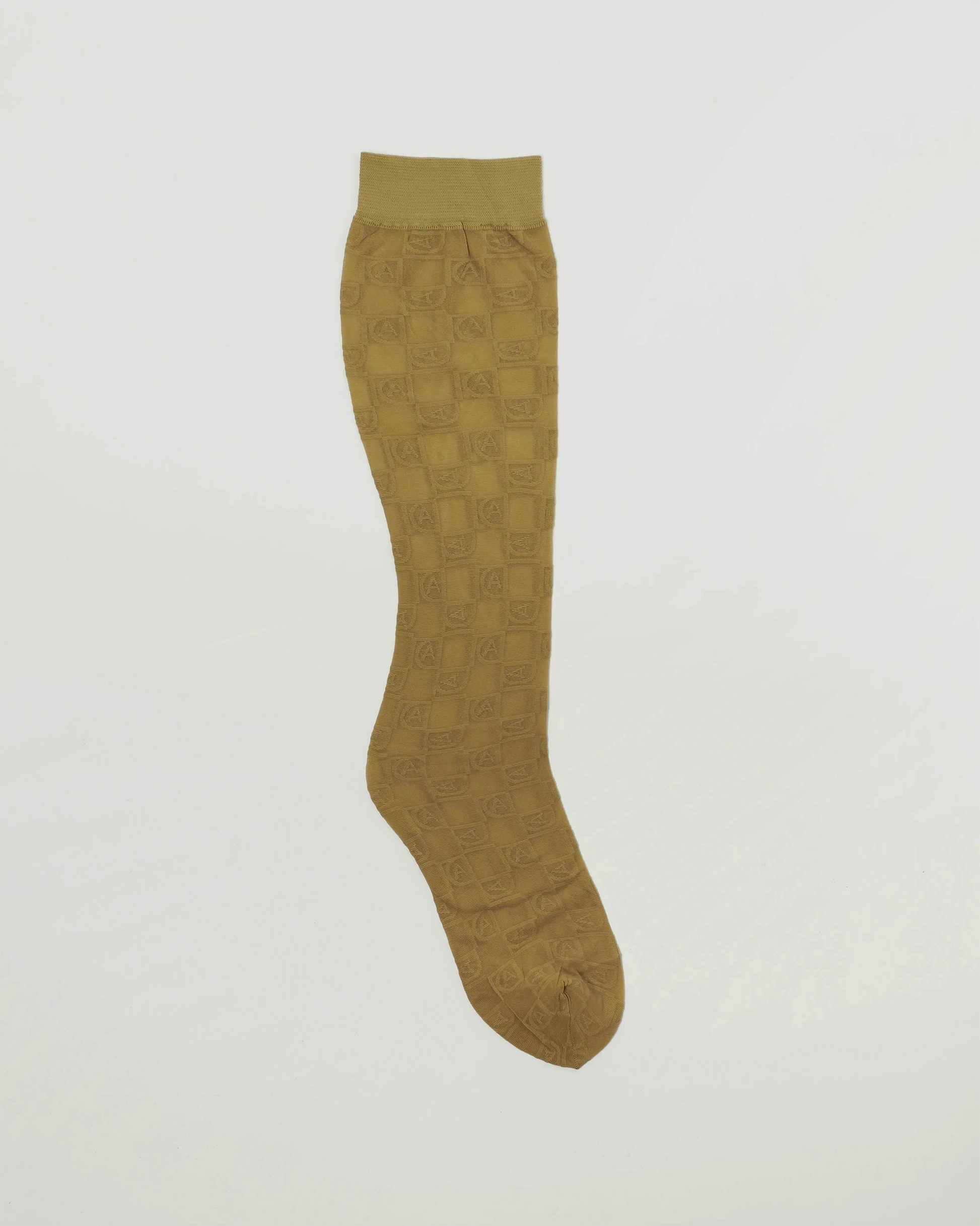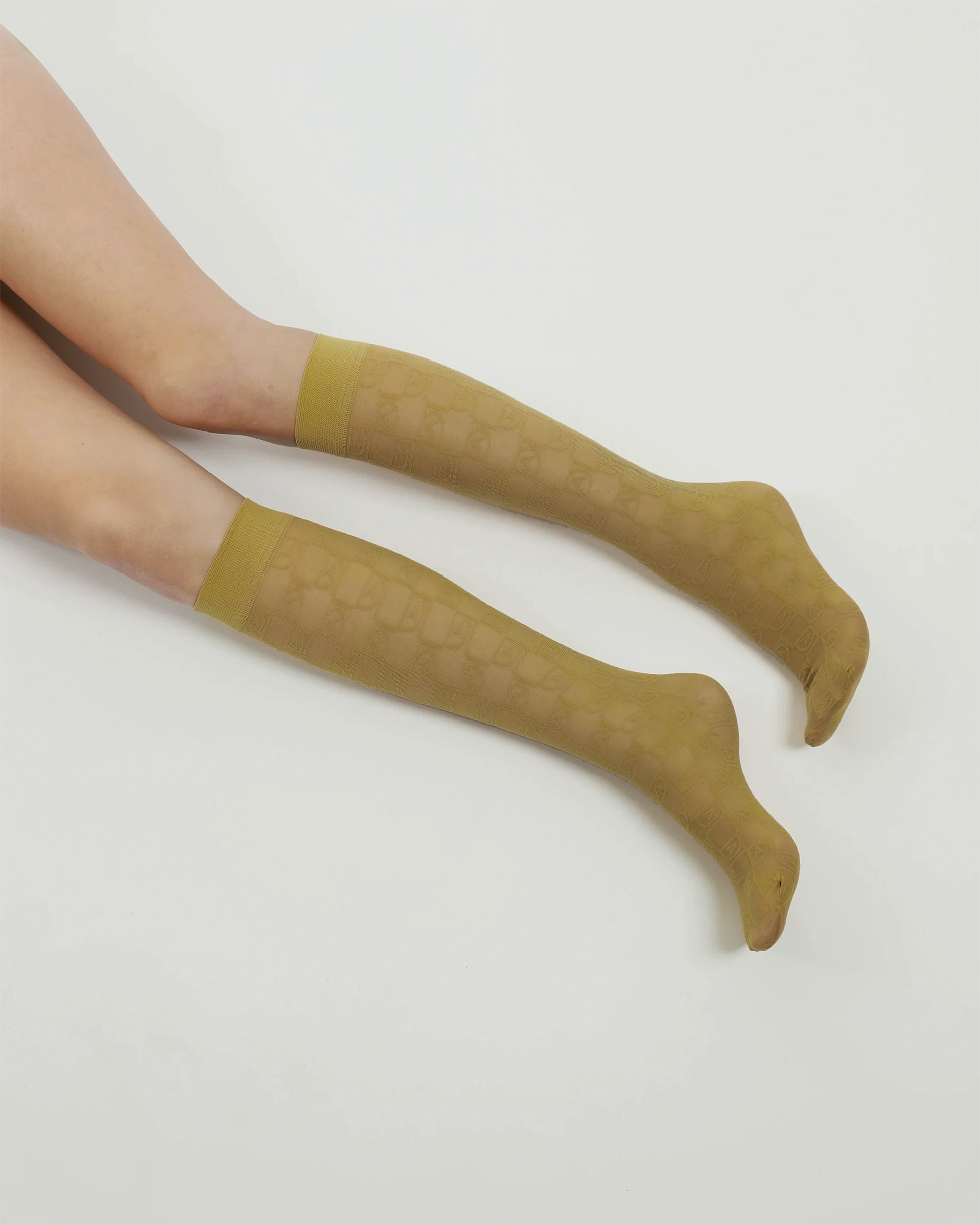 Una ripetizione del monogramma introduce la calzetteria DAL 1992. Calzini velati al ginocchio con fascia rinforzata. Lavorato a maglia in Italia, tinto a mano in Australia per l'intima arte del vestirsi.